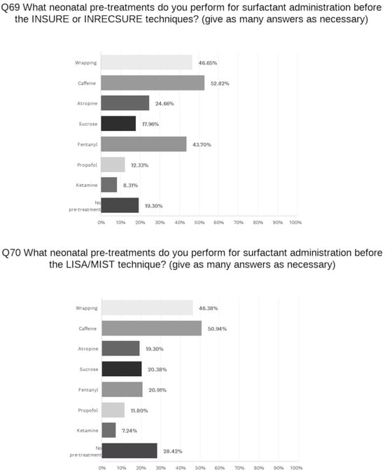 The aggregate ranking of indicators used by the NICUs to administer surfactant to newborns with RDS on NIV is as follows: level of FiO2; SpO2/FiO2 ratio; chest X-ray; Silverman score; lung ultrasound score. The threshold of FiO2 for administration of surfactant is ≤0.3 in 49% of the units (in detail: <0.25 in 5 units (1.3%), 0.25–0.29 in 33 (8.7%), and 0.3 in 150 (39.5%)), 0.31–0.4 in 42%, and ˃0.4 in 9%. About 40% of the units increase the FiO2 threshold when treating infants with a higher GA. The natural surfactants used are as follows: porcine (94%); bovine (21%); calf (8%). Synthetic surfactant is used in only 4% of the NICUs. Most of the units (66%) administer the correct dose/kg of the drug regardless of how many vials must be opened. A laryngeal mask (LM) is never used for surfactant administration. An endotracheal tube (ETT) for INSURE and a thin catheter for LISA/MIST (Minimally Invasive Surfactant Therapy) are equally used (48% and 52%) for surfactant administration during NIV. The most used device to perform LISA/MIST is a purpose-built instillation catheter (70%). Most of the units consider infants of ≥24 weeks GA to be suitable for the LISA/MIST technique, with the interval of 26–31 weeks being the most indicated. Only 17% of them use the technique in infants of <24 weeks. In 17% of centers, LISA/MIST is never used. Sixty-two percent of the NICUs perform a lung recruitment maneuver before administering surfactant, increasing CPAP or PEEP during conventional NIV or invasive ventilation, and MAP when using HFOV. The INRECSURE (Intubate-Recruit-Surfactant-Extubate) technique [] is used in 18% of centers, mostly in Italy where the technique was developed. When administering surfactant through an ETT, 51% of units use a closed circuit. When performing the INSURE technique, 56% of the NICUs remove the ETT immediately after the infant resumes breathing spontaneously, but in 20% of the units, this time varies from 30 min to 2 h or is undefined (24%). The most frequent pre-treatments for INSURE and LISA/MIST are indicated in Figure 5.