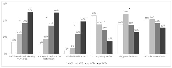 The prevalence of poor mental health during COVID-19 and suicide considerations increased with an increasing number of ACEs (see Figure 1). Adolescents with higher ACE scores were more likely to report poor mental health during COVID-19 (X2 [3, N = 1115] = 121.0, p < 0.0001), in the past 30 days (X2 [3, N = 1117] = 151.0, p < 0.001), and suicide considerations in the past 12 months (X2 [3, N = 1160] = 180.4, p < 0.0001). Conversely, adolescents with multiple ACEs reported less interpersonal support than adolescents with 0 ACEs (except for school connectedness (X2 [3, N = 1115] = 9.5, p = 0.08)); fewer reported caring adults (X2 [3, N = 1119] = 79.3, p < 0.0001) or supportive friends (X2 [3, N = 1114] = 35.3, p < 0.001).