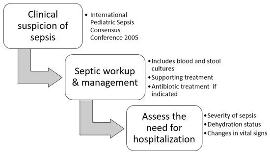 The Vesikari Scoring System (VSS) is a severity scale that has been widely adopted and may be considered a useful tool for distinguishing between bacterial and viral pathogens in pediatric gastroenteritis [12,13]. This study aimed to analyze the clinical spectrum of children with acute febrile infectious diarrhea, suspected sepsis, and VSS scores ≥ 10 who presented at our pediatric emergency department (ED). Additionally, the study aimed to identify the initial clinical characteristics that could help emergency physicians to predict acute infectious diarrhea outcomes.