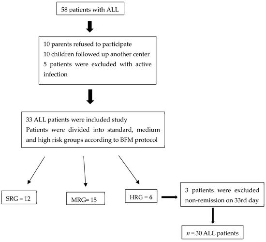 During the time of the study, 58 newly diagnosed ALL patients were admitted to our hematology–oncology clinic. In total, 10 parents of these patients refused to participate in the study, and 10 patients did not attend the follow-up because they were still being followed-up at another center during the remission period. A total of five patients were excluded from the study due to active infection at the time of diagnosis. A total of 33 patients and a control group of 30 individuals of similar ages (1–17 years) were included in the study. None of our ALL patients had t (4;11) or t (9;22) translocation. According to BFM risk classification, 12 patients were in the standard, 15 patients were in the medium risk group, and 6 patients were in the high risk group on the eighth day of remission induction treatment. Three of the six patients in the high risk group were excluded from the study because no remission was observed in the bone marrow control on the 33rd day. Thus, 30 ALL patients were compared with 30 healthy controls at the time of diagnosis and at the sixth month of remission (Figure 1).