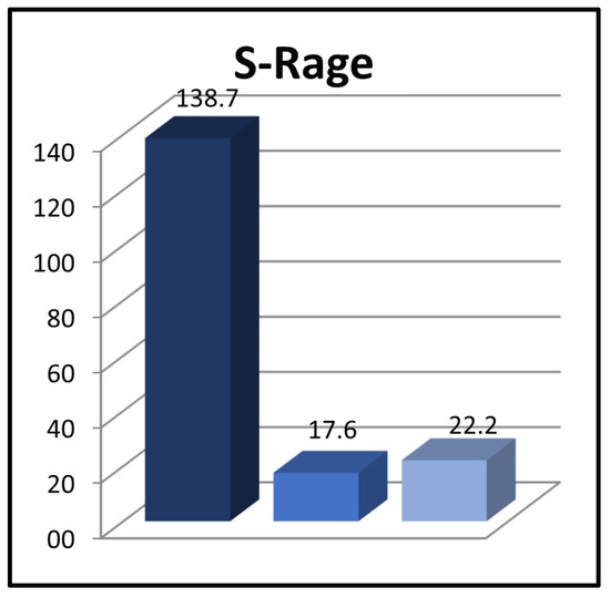 The RAGE protein is expressed as a soluble isoform (sRAGE) or a full-length RAGE isoform (fl-RAGE; mRAGE), which are bound to cell membranes. It has been reported that sRAGE, the soluble receptor of the final metabolite product of glycation, is freely found in tissue and circulation and acts as a decoy receptor that captures and binds RAGE ligands in the extracellular space. sRAGE is a variant of RAGE that carries all extracellular domains but does not contain the intracellular and transmembrane portion of full RAGE. Therefore, it acts as an endogenous competitive fl-RAGE inhibitor. It has also been shown to inhibit RAGE-induced cellular signaling, ultimately leading to tissue damage [17,18]. Additionally, sRAGE blood levels increase in relation to pathological pro-inflammatory processes and can be used as a biomarker of disease risk and negative outcomes [19].
