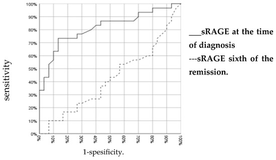 When comparing the levels of sRAGE among patients at diagnosis (138.7 ± 177.3 pg/mL), patients during the sixth month of remission (17.6 ± 21.1 pg/mL), and the control group (22.2 ± 23.7 pg/mL), it was observed that the levels were significantly higher in the patient group at the time of diagnosis than in both of the other groups (p = 0.000 and p = 0.000, respectively) (Figure 2).