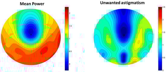 The MPDL comprised an ovoidal blur-free central area with a horizontal size of 7 mm and a peripheral treatment area consisting of an asymmetrical horizontal myopic defocus with an addition value of +1.50 D at 25 mm nasally and +1.80 D at 25 mm temporally. Additionally, the lens also featured a myopic defocus inferiorly with a value of +2.00 D. The spherical equivalent and cylinder power distribution maps for a plano prescription are shown in Figure 1.