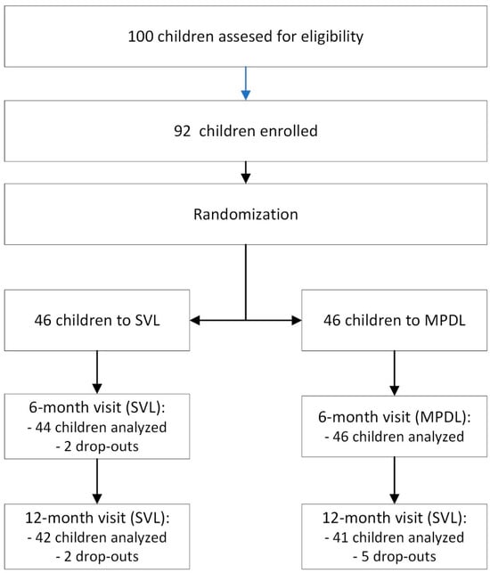 Out of 100 children who were assessed for eligibility, 92 were enrolled and randomized into two groups. The control group consisted of 46 children using SVL, and the study group included 46 children wearing MPDL. The flowchart in Figure 2 shows the enrollment and follow-up visits, indicating that 9 of the participants did not complete the study (4 in the SVL group and 5 in the MPDL group), resulting in a dropout rate of 9.8%. Finally, the 83 children analyzed were divided into 42 (50.6%) in the control group with SVL and 41 (49.4%) in the study group with MPDL.