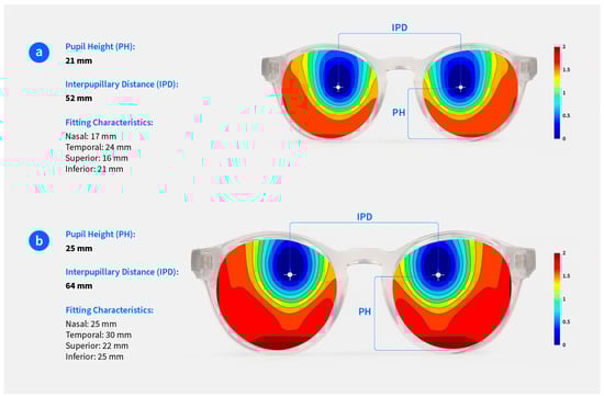 The fitting characteristics of the children varied as a result of different face physiognomies, leading to a range of distances from the pupil to the nasal side of the frame of 20 ± 2 mm (from 16 to 24 mm), to the temporal side of 30 ± 3 mm (from 24 to 35 mm), to the superior side of 14 ± 4 mm (from 8 to 23 mm), and to the inferior side of 26 ± 3 mm (from 20 to 32 mm). Figure 3 shows an illustrative example of the fitting characteristics of 2 participants of the study with extremely different face physiognomies, indicating the distances from the pupil to the nasal, temporal, superior, and inferior sides of the edge of the frame. In example A, the maximum positive defocus was 1.78 D, and in example B, the maximum positive defocus was 1.98 D.