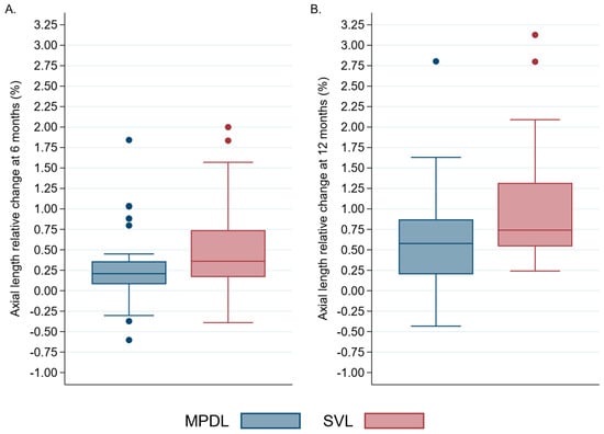 (A) Axial length relative change at 6 months (%), and (B) axial length relative change at 12 months (%). SVL: Single-vision lens; MPDL: Asymmetric myopic peripheral defocus lens.