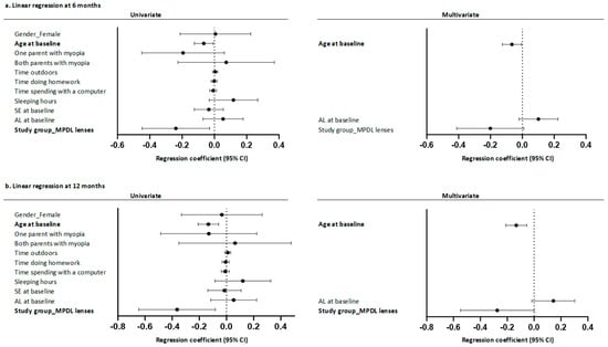 Multivariate analysis confirmed the effect of age, showing that, for each additional year of the child’s age at baseline, relative growth was lower at both 6 months (regression coefficient: −0.065, 95% CI: −0.125 to −0.004) and 12 months of treatment (regression coefficient: −0.133, 95% CI: −0.212 to −0.054). In addition, multivariate regression analysis revealed that regardless of the child’s age and AL at the beginning of treatment, the relative growth of AL in children in the MPDL group tended to be lower after 6 months (regression coefficient: −0.238, 95% CI: −0.447 to −0.029) and was significantly lower at 12 months (regression coefficient: −0.275, 95% CI −0.548 to −0.001) compared to that in children in the SVL group (Figure 5).