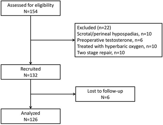 The inclusion criteria were boys with congenital hypospadias, otherwise healthy, and planned for one-stage hypospadias repair. Exclusion criteria were scrotal or perineal hypospadias, treatment with preoperative testosterone, treatment with hyperbaric oxygen, patients who underwent a planned staged hypospadias repair, and those who were lost to follow-up.