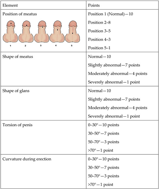- Weber, D.M.; Landolt, M.A.; Gobet, R.; Kalisch, M.; Greeff, N.K. The Penile Perception Score: An instrument enabling evaluation by surgeons and patient self-assessment after hypospadias repair. J. Urol. 2013, 189, 189–193. [Google Scholar] [CrossRef]