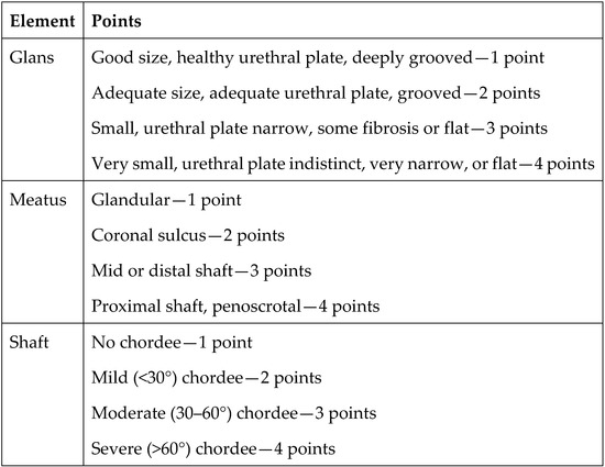 Preoperative risk factors for developing urethroplasty complications have been evaluated using the Glans–Urethral Meatus–Shaft (GMS) score [8,9]. The GMS score assesses the severity of hypospadias based on the size of the glans, quality of the urethral plate, meatal position, and degree of curvature. Each of these three components is scored numerically on a scale of 1 to 4, with more unfavorable characteristics being assigned higher values. The values are then summed to determine the GMS score. The lowest possible GMS score is 3 (very mild hypospadias), and the highest score is 12 (severe hypospadias) (Figure 3). The score is classified into three levels: mild (3–6), moderate (7–9), and severe (10–12). There is a correlation between the GMS score and postoperative UC [10]. However, additional studies examining predictors of poor cosmetic outcomes in repeat operations are needed.