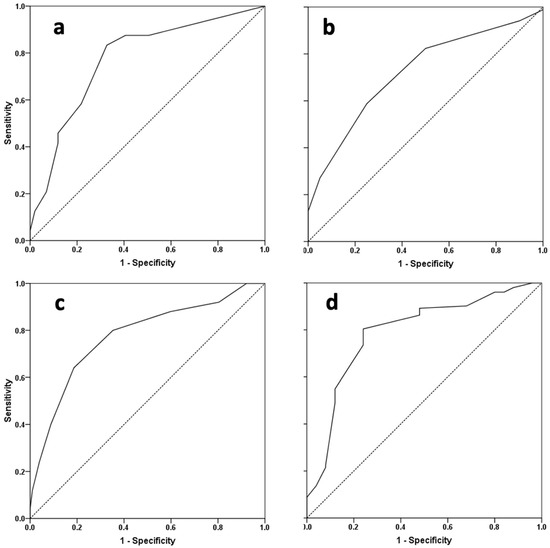 Receiver operating characteristic curves of (a) baseline chordee degree, (b) glans width, (c) GMS score, and (d) preoperative HOPE score as markers of optimal cosmetic outcomes (HOPE score ≥ 57).