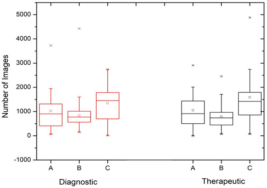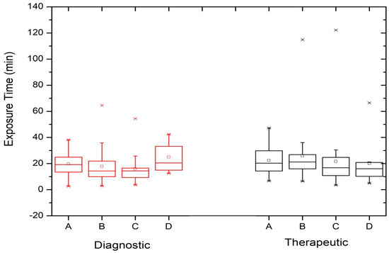 Figure 1 shows that the results of the image acquisition runs (number of images) are very similar when comparing the diagnostic and therapeutic procedures. Differences in the third quartile values of the exposure time distributions between the diagnostic and therapeutic procedures can be observed in Figure 2, suggesting that, with the exception of Institution D, therapeutic procedures generally require higher exposure times, which can be explained by the complexity of pathologies and procedures. These differences become more apparent when considering procedures with longer exposure times.