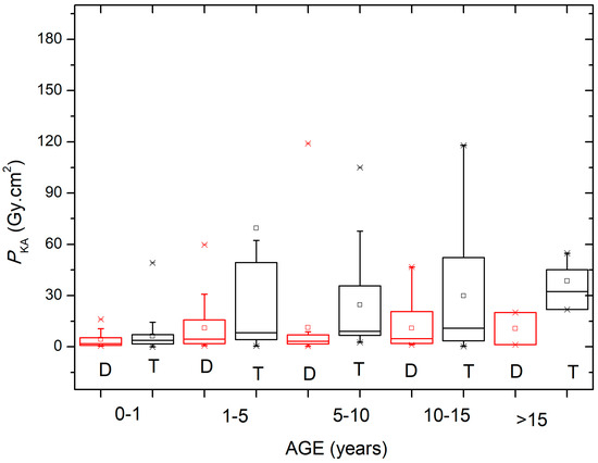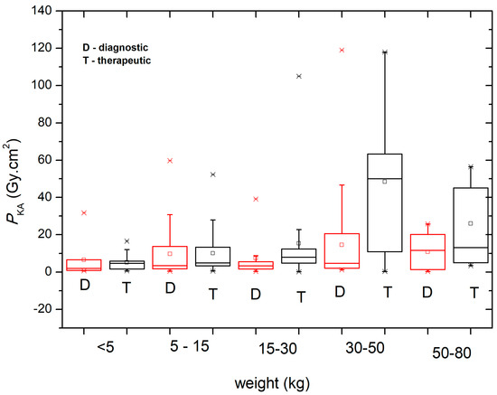 In general, a wide range in PKA was observed when comparing the therapeutic and diagnostic procedures for all age groups (Figure 3). When PKA data were grouped according to patient weight, a large variation was observed in the range of 30–50 kg for therapeutic procedures (Figure 4). The PKA values (median and third quartile) shown in Table 4 reinforce the findings of similar studies, pointing out that there are significant differences between diagnostic and therapeutic procedures, whether data are grouped by patient weight or age.