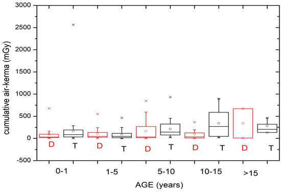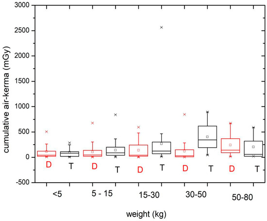Figure 5 and Figure 6 show the cumulative air kerma values obtained during the diagnostic (D) and therapeutic (T) procedures according to the patient age and weight groups. Table 5 shows the median and third quartile of Ka,r for the diagnostic and therapeutic procedures, taking into account the patient age and weight groups.