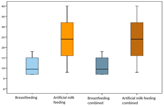 In 24% of the cases, a combination of both breastfeeding and artificial milk feeding was observed. For these children, the median age at the cessation of breastfeeding was 9.5 months (Figure 1), with an IQR of 7 to 18, while the median age at the end of artificial milk feeding was 21 months (Figure 1), with an IQR of 8 to 24.