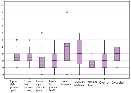 Some significant relationships were detected (Table 7). The overjet has an inverse association of medium–strong magnitude with fluid intake (p = 0.001). The greater the weekly fluid consumption, the lower the value of the overjet. For the number of semi-solids, the interpretation was similar. On the other hand, the lower diastema seems to increase if the number of times solids are taken is very high.