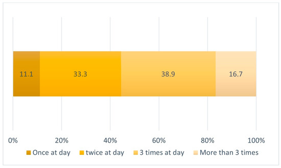 Figure 3 provides information on the times per day when the bottle was taken. It highlights that the bottle was commonly used during breakfast (88.9%), dinner (55.6%), recena (evening snack) (50%), and night shots (44.4%). When the total number of daily bottle shots is added, the following distribution can be established (Figure 3).