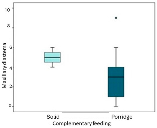 These findings suggest that the type and timing of complementary feeding, particularly the introduction of solid foods, may have an impact on dental development, specifically in relation to maxillary diastema and the alignment of the back teeth.