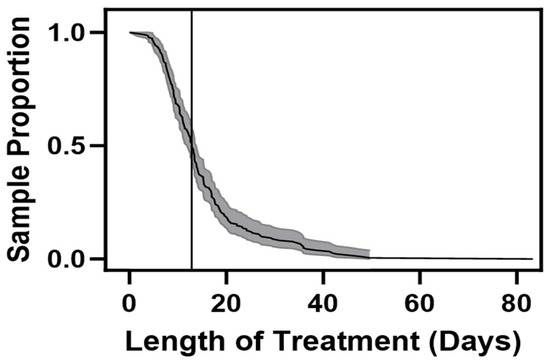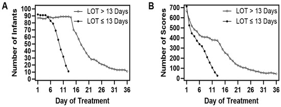 We utilized data from a total of 182 unique infants having a median LOT of 12.86 days (Figure 1). Rounding to 13 days as our cutoff for creating treatment groups for comparison, one infant had a LOT between 12.86 and 13 days, and therefore 92 infants were treated for fewer than 13 days, and 90 were treated for more than 13 days. The number of infants and the total number of FS contributed per day are given in Figure 2A,B, respectively.