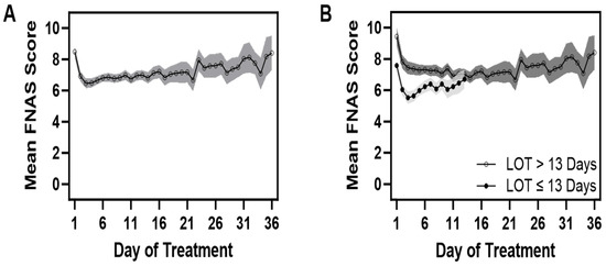 (A,B) The means (95% CI) of the Finnegan scores (FNAS Score) are plotted over time (duration or day of treatment) for all infants in the sample in panel A, while in panel B, the means (95% CI) of the Finnegan scores are plotted separately for those with a LOT ≤ 13 and a LOT > 13 days.