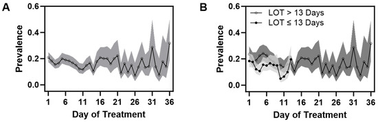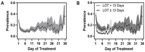 (A,B) Daily mean prevalence (95% CI) of excessive or continuous high-pitched crying and/or sleep < 1 h in all infants (A) and when infants were grouped as to length of treatment (B). Note the sporadic increases in prevalence in infants with a LOT > 13 days.