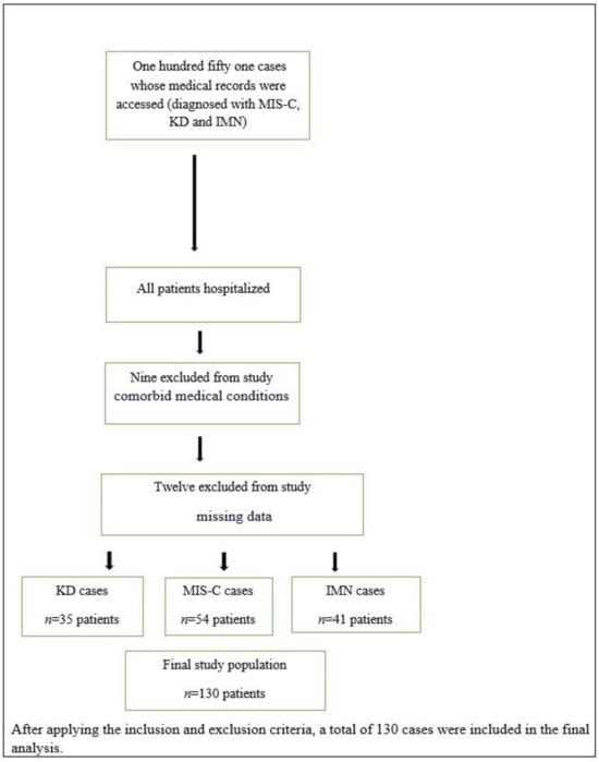 This study was conducted in a pediatric tertiary education institution located in Istanbul, Turkey, spanning from 12 March 2020 to 13 September 2022. We enrolled 130 children aged <18 years diagnosed with MIS-C, classical KD, or atypical KD and IMN. A flowchart illustrating the case identification and selection strategy is shown in Figure 1. Patient data were obtained from the hospital’s information system, including age, sex, symptoms on admission, initial examination findings, laboratory information, imaging records, pediatric infection history, and pediatric rheumatology and cardiology consultation records.