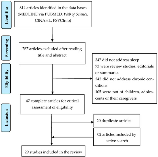 Data were collected between March and July 2022. The data bases searched were MEDLINE® (via PubMed®), Web of Science, Cumulative Index of Nursing and Allied Health (CINAHL), and PSYCInfo. The standard search strategy, using controlled descriptors and alternative terms identified in Medical Subject Headings (MESH), was: (Child OR Children OR Adolescent OR Adolescents OR Teen OR Teenager OR Youth) AND (“Chronic Disease” OR “Chronic Diseases” OR “Disease, Chronic” OR “Chronic Illness” OR “Illness, Chronic” OR “Chronic condition” OR “Chronic Conditions”) AND (Sleep OR “Sleep patterns” OR “Sleep Habits” OR “Sleep Wake Disorders” OR “Sleep Wake Disorder” OR “Wake Disorders, Sleep” OR “Sleep Disorders” OR “Sleep Disorder”) AND (Caregivers OR Caregiver OR Parents OR Family OR “Family Caregiver” OR Families OR “Family Members”). Also, the terms “Child, Preschool”, Infant and Adolescence, found in the CINAHL headings, were added to the search of the CINAHL base, and the terms “Child Health” and “Adolescent Health”, found in the APA thesaurus, were added to the search of the PSYCInfo base. Other articles were included by active searching.