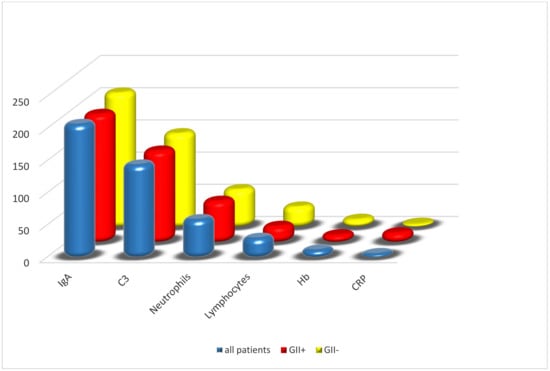 We divided patients into two groups according to whether they had gastrointestinal involvement or not: the comparison of all variables revealed no statistically significant difference in terms of the patients’ sex (14 males in the group with gastrointestinal involvement versus 82 males in the other, p = 0.23) and the patients’ age (91 ± 37 months in the group with gastrointestinal involvement versus 78 ± 36 months in the other, p = 0.13). Data comparing the mean values of IgA, C3, CRP, hemoglobin and the percentages of both neutrophils and lymphocytes in the total count of white blood cells at the patient’s first assessment in relation to the occurrence of gastrointestinal involvement are shown in Table 1. Hemoglobin, CRP, C3 and IgA showed no differences between the groups; in patients with gastrointestinal involvement, the percentage of neutrophil granulocytes was significantly higher, and that of lymphocytes was significantly lower than in patients without gastrointestinal involvement (65.2 ± 13% versus 58.8 ± 12%, p = 0.02, and 26.4 ± 11% versus 32.1 ± 11,% p = 0.02, respectively). Figure 1 depicts the laboratory data found on patients with IgAV with and without gastrointestinal involvement.