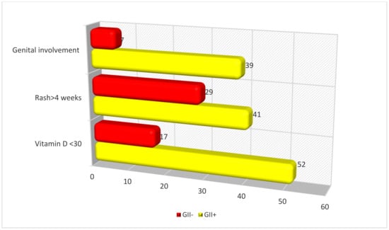 Clinical data associated with gastrointestinal involvement in the multivariate analysis of patients with IgA vasculitis. p = 0.003 for vitamin D < 30 ng/mL, p = 0.034 for rash > 4 weeks, p = 0.05 for genital lesions (data are expressed in percentages).