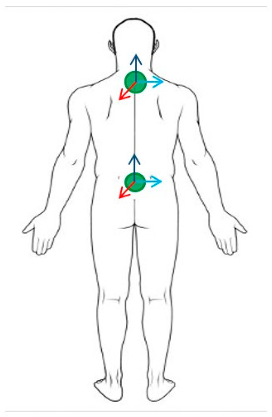 The participants executed a standardized series of tasks in a single 2-h lab-based testing session at Temple University. The primary physical and demographic characteristics recorded were chronological age and standing height. Standing height was measured for each athlete and recorded using a standard procedure and tape measure. Chronological age was self-reported and recorded in years and months. Trigno inertial measurement unit (IMU) sensors (Delsys, Natick, MA, USA) were placed (Figure 1) on the upper trunk at the level of the seventh cervical vertebra (C7) and on the lower trunk at the level of the fifth lumbar vertebra (L5). Sensors were also placed on the right and left recti femoris for within-test observational purposes to ensure the efficacy of the fatigue protocol in engaging the muscles of the leg. The location of placement for each sensor was determined through manual palpation of the areas indicated in green in Figure 1. The sensors were mounted superficially to the skin with double-sided adhesives at the determined locations. Following sensor placement, the participants completed a researcher-directed 15-min warm-up on the treadmill to familiarize themselves with the treadmill environment. During this warm-up period, the participants began at a researcher-selected slow walking pace of 0.8 m/s. At the culmination of each subsequent 45-s interval, the speed of the treadmill was increased in increments of 0.2 m per second until the subject reached their walk-to-run transition speed. The participants were given 45 s at each speed interval to ensure that they were able to reach their natural gait pattern at that speed. As the walk-to-run transition approached, many initially began to run as the speed increased and then settled back into a fast walking gait within a few strides. Once the participant remained in a running gait for the entirety of the interval, the treadmill speed was increased one increment further. Following this brief bout of running gait, the speed of the treadmill was decreased in the same sequential increments at the same time intervals. At each descending speed, once a full interval of walking gait was resumed, the participants were asked to characterize how their current walking speed felt relative to their preferred comfortable walking pace (i.e., faster, slower, or right on). The participants were instructed to evaluate their current speed relative to the speed at which they would walk down the street if they were not in a rush. Slow (SWS) and fast (FWS) walking speeds were calculated, respectively, to be 70% and 130% of a participant’s self-reported preferred walking speed (PWS) [13]. In two cases, the calculated fast walking speed fell at the participants’ walk-to-run transition speed. In these cases, the fast walking speed was adjusted by 0.2 m/s to be below the participant’s walk-to-run transition speed. Paced walking above the natural walk-to-run transition speed has been shown to significantly increase attentional and cognitive demand [14], which, in turn, impacts gait performance.