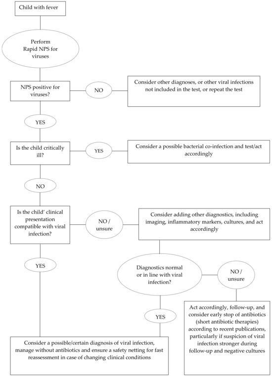 It is important to highlight that three children (representing 18.8% of those with bacterial infections) also tested positive for viruses, highlighting what is already known about a good, but not perfect, PPV of viral tests to rule-out bacterial infection. However, this is not surprising since the complexity of medicine and clinical presentations have never led to the development of single diagnostics that have 100% sensitivity and specificity for a specific condition. Rather, the diagnostic process is a complex activity that requires the elaboration of several parts of information, from clinical history and examination to different steps of diagnostics. In this context, rapid NPSs need to be considered as one of the tools that clinicians have to diagnose a viral (or bacterial) infection, in a process that needs to be personalized based on each child’s presentation. Given their good positive and negative predictive values, in combination with rapid results and low invasiveness, rapid NPSs can be used as a useful initial assessment tool, which may require, or not, further approaches to confirm a clinical suspicion according to the specific scenario, as suggested in Figure 1. Importantly, no single test will probably ever prevent a child diagnosed with a mild, viral infection, worsening in the following days and coming back with a serious bacterial infection. The reasons are multifactorial (e.g., viral infections can facilitate subsequent bacterial infections, even days to weeks after the initial infection), but clinicians and the public should be aware that these scenarios only rarely refer to wrong medical decisions but instead to new events. As mentioned in a famous emergency medicine editorial, “sick children look sick”, the child returning with worsening clinical conditions is, in most cases, simply unpredictable.