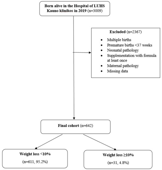 This retrospective study was conducted in a tertiary perinatal center (the Neonatology Department at the Hospital of Lithuanian University of Health Sciences (LUHS) Kauno klinikos), accredited as a baby-friendly hospital (BFH). The decision to add formula supplementation in our hospital is made when the weight loss threshold is more than 10% and lactation is insufficient. At the 7% threshold, close-up evaluation for possible breastfeeding problems is performed.