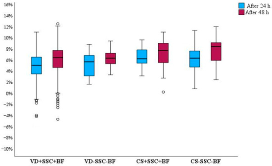 The median of weight loss in the VD+SSC+BF group was 5% after 24 h and 6.4% after 48 h. The median of weight loss in the VD-SSC-BF group was 5.7% after 24 h and 6.3% after 48 h. The median of weight loss in the CS+SSC+BF group was 6.2% after 24 h and 7.7% after 48 h. The median of weight loss in the CS-SSC-BF group was 7.6% after 24 h and 8.4% after 48 h. There is a noticeable pattern that neonates tend to lose more weight if they do not get SSC and breastfeeding in the first hour after birth (p > 0.05).