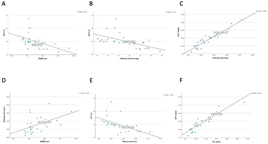 (A) Moderate correlation of 6MWD to tSCT (r = −0.544; p = 0.003). (B) Strong correlation of tSCT to VO2max (mL/min/kg) (r = −0.672, p < 0.001. (C) Very strong correlation of SCT-Index to VO2max (mL/min) (r = 0.927; p ≤ 0.001). (D) Moderate correlation of 6MWD to VO2max (mL/min) (r = 0.473, p = 0.011). (E) Strong correlation of tSCT to VO2max (mL/min) (r = −0.764; p ≤ 0.001). (F) Very strong correlation of oxygen pulse to SCT-Index (r = 0.921, p ≤ 0.001).