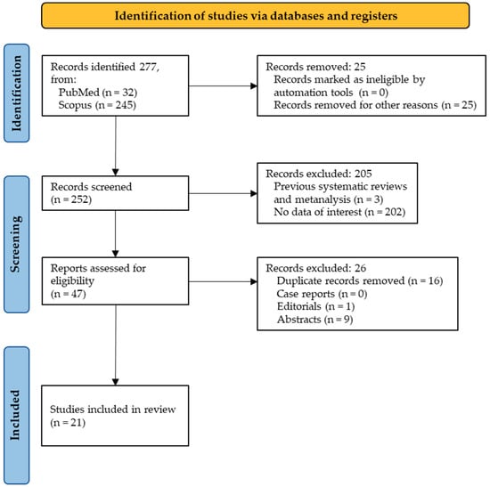 The initial search provided a total of 277 studies: 32 from PubMed and 245 from Scopus. No studies were removed for being marked as ineligible by automation tools, while 25 studies were removed for other reasons, for example, for the study of other diseases in addition to diabetes, or for the analyses of other cytokines. A total of 252 studies were included in the screening phase, and a total of 205 studies were removed because of a lack of data of interest (202) or because they were a systematic review with or without metanalysis (3). Eligibility was assigned to 47 studies, from which 16 were removed for being duplicates, 9 for being abstracts, and 1 for being an editorial. Finally, a total of 21 studies were involved in the inclusion phase (Figure 1).