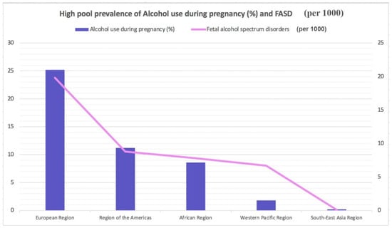 The global prevalence for FASD in the general population is approximately 7.7 cases per 1000 individuals. FASD prevalence is lowest in the WHO Eastern Mediterranean Region (0.1 per 1000) and highest in the WHO European Region (19.8 per 1000) (Figure 1) based on the rates of alcohol use during pregnancy. According to global epidemiological data, an estimated 1 in 13 women who drink alcohol during pregnancy will deliver a child with FASD, resulting, globally every year, in the birth of almost 630,000 children with FASD [10,11].