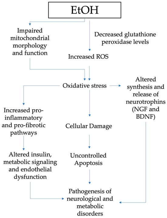 Pathogenesis of neurological and metabolic diseases and role of oxidative stress in patients exposed to alcohol in the prenatal period (EtOH, ethanol; ROS, reactive oxygen species; NGF, nerve growth factor; BDNF, brain-derived neurotrophic factor.