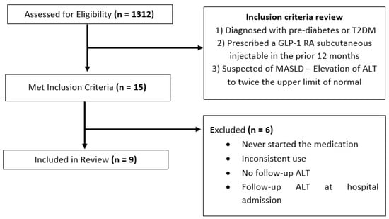 A search was conducted using CHOA’s EHRs, Epic. The inclusion criteria were as follows: (1) diagnosed with pre-diabetes or type 2 diabetes mellitus, (2) prescribed and initiated on a GLP-1 RA subcutaneous injectable in the preceding 12 months, and (3) suspected or confirmed MASLD as indicated by alanine aminotransferase (ALT) elevated to more than twice the upper limit of the normal range (>50 U/L for males, >44 U/L for females) in the prior six months in the absence of other liver diseases or a clinician-provided diagnosis of MASLD. A study by Schwimmer et al. found this ALT cut off to have a sensitivity of 88% and specificity of 26% in the diagnosis of MASLD in obese children older than 10 years old [17]. Individual insurance coverage determined the type of GLP-1 RA used for each patient. All currently approved GLP1-RAs for children were included. Clinic charts were reviewed to determine compliance to the medication. ALT, hemoglobin A1c (HbA1c or A1c), and body mass index (BMI) values were obtained. Five patients were excluded for never having started the medication, using the medication inconsistently, or not having a follow-up ALT. One patient was excluded, as follow-up ALT measurements were obtained during a hospital admission (see Figure 1). One 20-year-old patient was included because patients can be seen up to the age of 21 at CHOA.