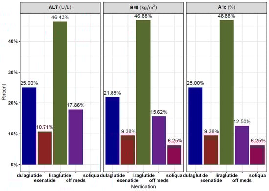 The GLP-1 RAs used included dulaglutide (3 patients), liraglutide (5 patients), exenatide (1 patient), and a combination drug of glargine and lixisenatide (brand name Soliqua, 1 patient). Figure 2 summarizes the proportion of medication usage for A1c, ALT, and BMI, respectively, at baseline and all follow-up visits. All patients were on optimal doses of GLP-1 RAs (dulaglutide 1.5 mg weekly, exenatide 2 mg weekly, or liraglutide 1.8 mg daily) at the time of measurement. All nine patients had at least one follow-up (or subsequent) ALT, HbA1c, and BMI recorded following initiation of the GLP-1 RA. Six patients had a second follow-up ALT, eight had a second follow-up BMI, and seven had a second follow-up A1c. There was a notable decrease in patients with more than two follow-up values for all three parameters.