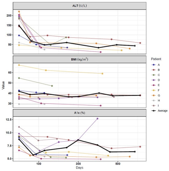 The average time between baseline and the final follow-up for ALT, A1C, and BMI was 321 ± 210, 360 ± 168, and 349 ± 170 days, respectively (Figure 3). At this final clinical follow-up time point, the median ALT was 34 U/L (24, 58), corresponding to a percentage decrease of 61.2% (59.7%, 80.1%) from baseline. The median BMI was 37.6 kg/m2 (36.0, 40.2), representing a percent decrease of 2.4% (0.0%, 12.3%) from baseline. The median A1c was 5.6% (5.4, 6.8), indicating a percent decrease of 25.8% (21.5%, 37.4%) from baseline.