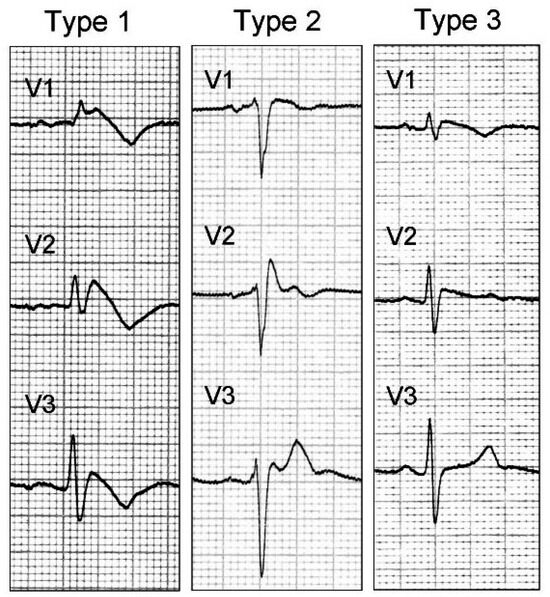- Type 2 or type 3 ECG pattern when, after a provocation test, a type 1 ECG pattern is induced [11].