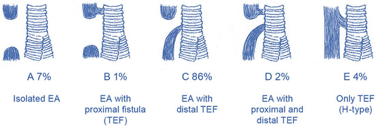 Esophageal atresia (EA) is a rare congenital condition referring to an incomplete formation of the esophagus. There are different anatomical subtypes of EA with varying prevalence. EA is frequently associated with a tracheoesophageal fistula (TEF). Figure 1 provides an overview of the anatomical subtypes of EA according to the Gross classification system, including Gross A (isolated EA), Gross B (EA with proximal TEF), Gross C (EA with distal TEF), Gross D (EA with proximal and distal TEF) and Gross E (only TEF) [1]. EA also coincides with other anomalies, including the cardio-vascular (24–31%), uro-genital (19–21%), digestive (13–23%) and musculoskeletal (14–29%) [2,3]. Following Dr Cameron Haight’s first successful primary repair of EA in 1941 [4], the mortality rates of these children have decreased considerably, especially in the last decenniums [5]. Today, the vast majority of them undergo esophageal repair within the first days of life, with survival rates reaching around 90% [1]. This development has given rise to a new generation of survivors [6]. These children can be faced with long-term digestive morbidity (43–71%), including dysphagia [7], anastomotic strictures, gastroesophageal reflux disease [7,8,9], and feeding difficulties [10], as well as respiratory morbidity (52–69%), with wheezing, cough, dyspnea and recurrent respiratory infections [11,12]. The children risk growth retardation [13]; however, in affected children their growth may normalize at 12 years and beyond [14]. According to expert recommendations [15,16], health care providers of patients with EA should focus on optimizing their health-related quality of life (HRQOL).