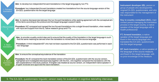 The forward–backward translation approach of the EA-QOL questionnaire is overviewed in Figure 3. After the establishment of the EA-QOL questionnaire in Sweden and Germany, the questionnaire was translated into 11 additional languages between 2017 and 2022, as described in more detail in Supplementary File S1. The translations worked as a basis for additional testing in 12 countries.