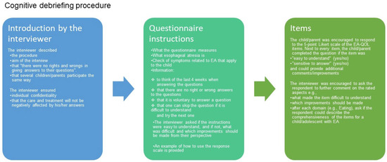 Cognitive debriefing interviews are used to gain information about how respondents experience and understand a questionnaire. Therefore, this method was used to make sure if and how the items of the EA-QOL questionnaire were adequate, understood in the way that instrument developers meant, and inclusive and complete, relative to the target concept (condition-specific HRQOL) and population (children with EA) [28,31,44]. As such, it aimed to maximize children’s and parents’ understanding of the translations and establish content validity.