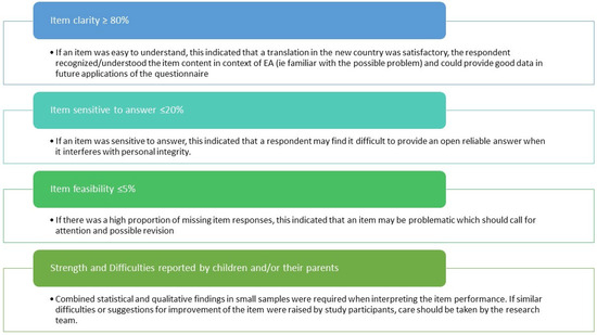 The quantitative and qualitative information was analyzed against predefined psychometric criteria also applied in the initial analysis of the performance of the EA-QOL questionnaires [33,34], as presented in Figure 5. These criteria were used to indicate the need for adjusting and rewording the item in order to better achieve linguistic, cultural and conceptual adequacy in the specific country/language.