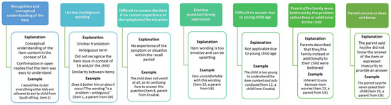 - Unclear/ambiguous wording: across 2–4 countries, four items within the eating domain asking about the child’s experiences of food getting stuck (item 1), choking (item 5–6), and vomiting (item 8) received comments from ≥5 children and/or parents that considered unclear/ambiguous wording. These comments gave explanations as to why parents in Norway and the UK rated some items “not easy to understand”. Parents in China wished for clarification of the idea that food gets stuck in the esophagus, not the throat (item 1). Parents in three countries (China, the UK and Hungary), also asked about the definition of “choke” (item 5–6), to ensure it referred to “cough caused by inhalation of food into the trachea while eating” [45]. The parents from the UK described the fact that two original items needed clarification as to whether the child was bothered by the symptom or only if the symptom was present in the child (items 1 and 8), and asked if vomiting (item 8) included regurgitation;