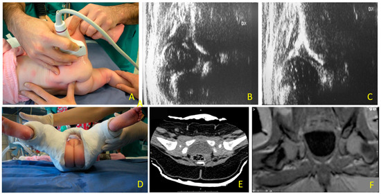 Hip dislocation: (A) ultrasound evaluation with lateral approach to the hip joint according to Graf technique during reduction maneuver; (B) type IV hip; (C) femoral head in the acetabular fossa after closed reduction, before performing a pelvi-podalic spica cast (SC); (D) the SC has been applied. With SC, Graf’s technique cannot be applied anymore, to check if the hip is reduced or not, (E) to verify the position of the femoral head in SC, computer tomography (CT) or (F) magnetic resonance (MR) can be used.