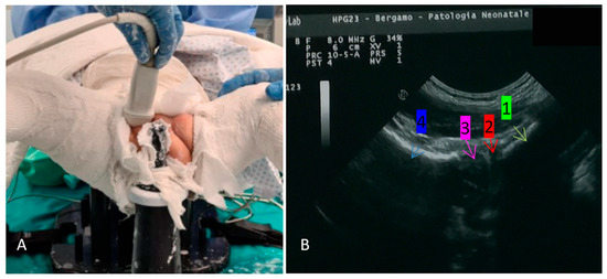 (A) The patient is in narcosis on a pediatric table, the SC has already been performed (in human position, according to Fettweis); the right hip is checked with TIT, through the same perineal opening of the cast used for wipers; and (B) the sonographic image obtained in the same patient after reduction: 1 ramus superior os pubis, 2 labrum, 3 femoral head, 4 femoral neck.