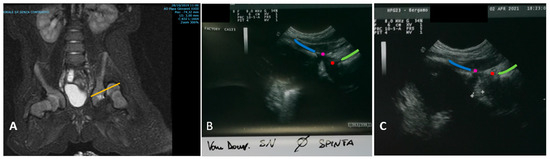 Once SC has been applied, the position of the head must be evaluated, to check if the hip is reduced or not [5]. Different techniques are available to verify the position of the femoral head in SC: X-ray [6], computer tomography (CT) [7,8,9], magnetic resonance (MR) [5,6,10,11] and ultrasound (US) [10,12]. According to Graf’s technique, ultrasound examination should be performed in a frontal standard plane, approaching the hip laterally and avoiding tilting errors of the probe [13] (Figure 1); however, Graf’s method is not applicable in the presence of a SC. More recently, different sonographic techniques have been described, to overcome the problem of hips being covered by a cast [14,15,16]. Among those different US approaches, one of the most used is the transinguinal approach (TIT) described in 2003 by van Douveren et al. [12]. Over the following 20 years, more authors compared TIT with other available techniques as gold standard, such as radiographs or CT [10,17].