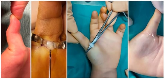 - Farr, S.; Grill, F.; Ganger, R.; Girsch, W. Open surgery versus nonoperative treatments for paediatric trigger thumb: A systematic review. J. Hand Surg. 2014, 39, 719–726. [Google Scholar] [CrossRef]